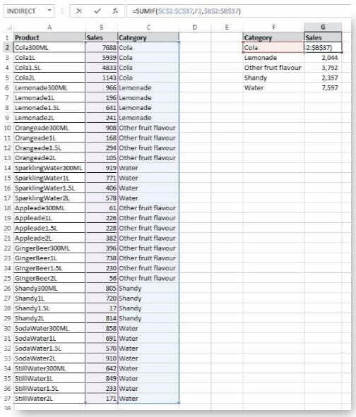 Sama seperti COUNTIF, SUMIF sangat berguna ketika Anda ingin mengeluarkan informasi ringkasan dari kumpulan data besar. Pada contoh gambar di bawah ini, kami menambahkan penjualan yang cocok dengan kategori Cola.